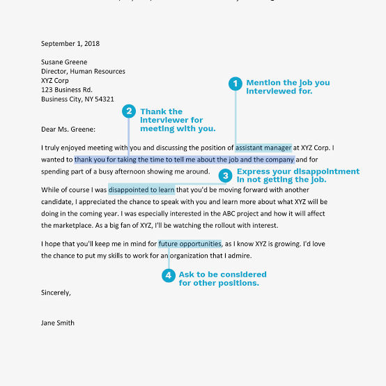 Also, indicate how many interviews you have had and when you received a letter or communication that you did not get the job. Express your appreciation for being considered for the job, even if you have already sent a thank-you note immediately after your last interview.