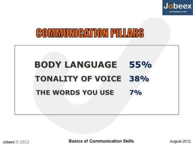 According to the research, only 7% of the message received by the recipient is based on the sender’s actual words, 38% is on par language (volume, tone, and speed of motion) and 55% is based on unbelievable signal (body language).